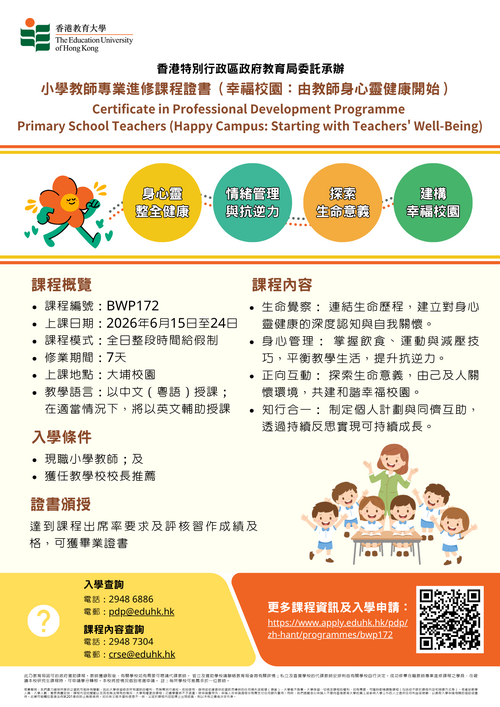 | 教师专业进修课程证书 (幸福校园: 由教师身心灵健康开始) (小学)* | |